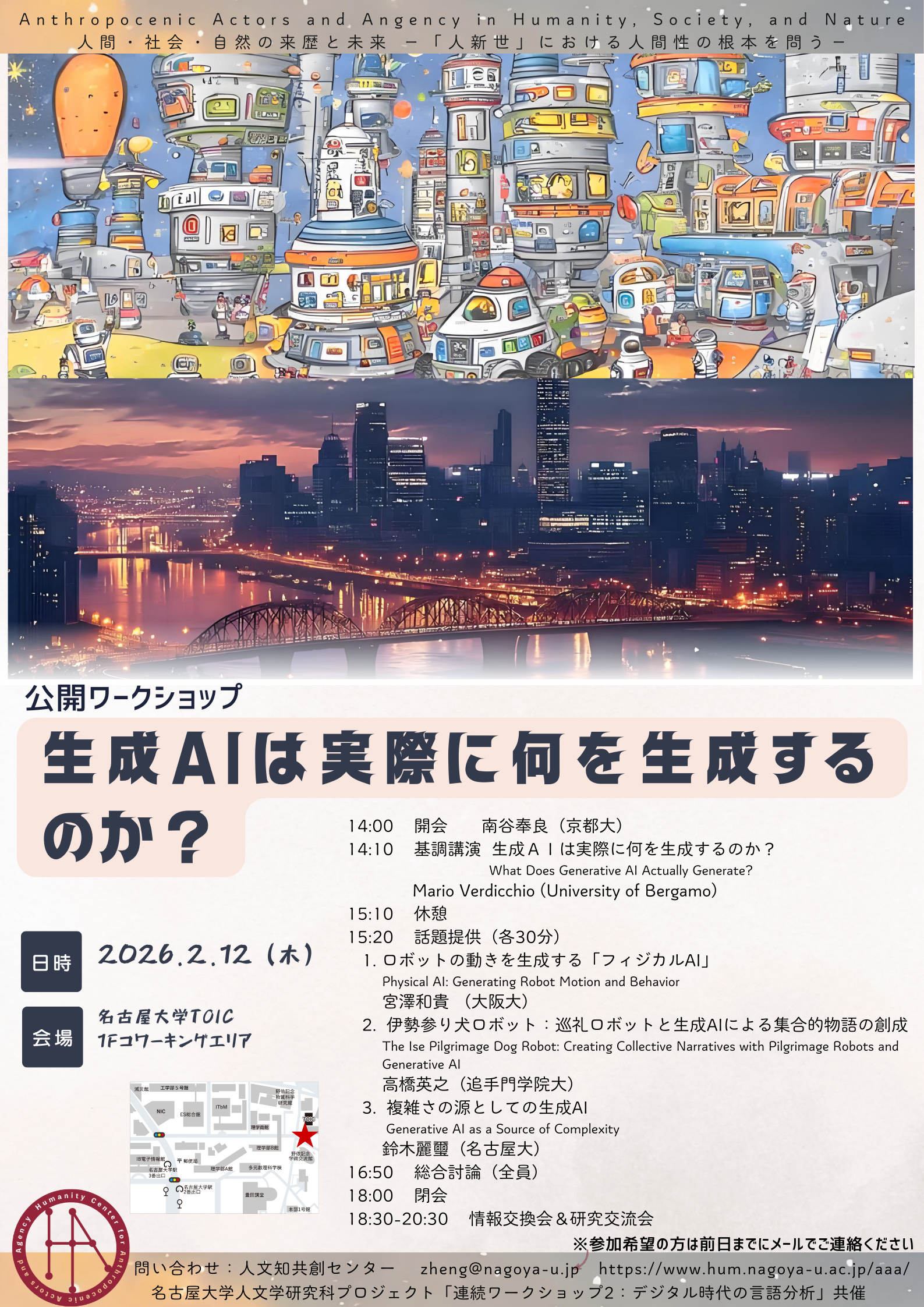 A public workshop titled “What Does Generative AI Actually Generate?” was held at the TOIC Co-working area(1F), Nagoya University, on February 12, 2026.